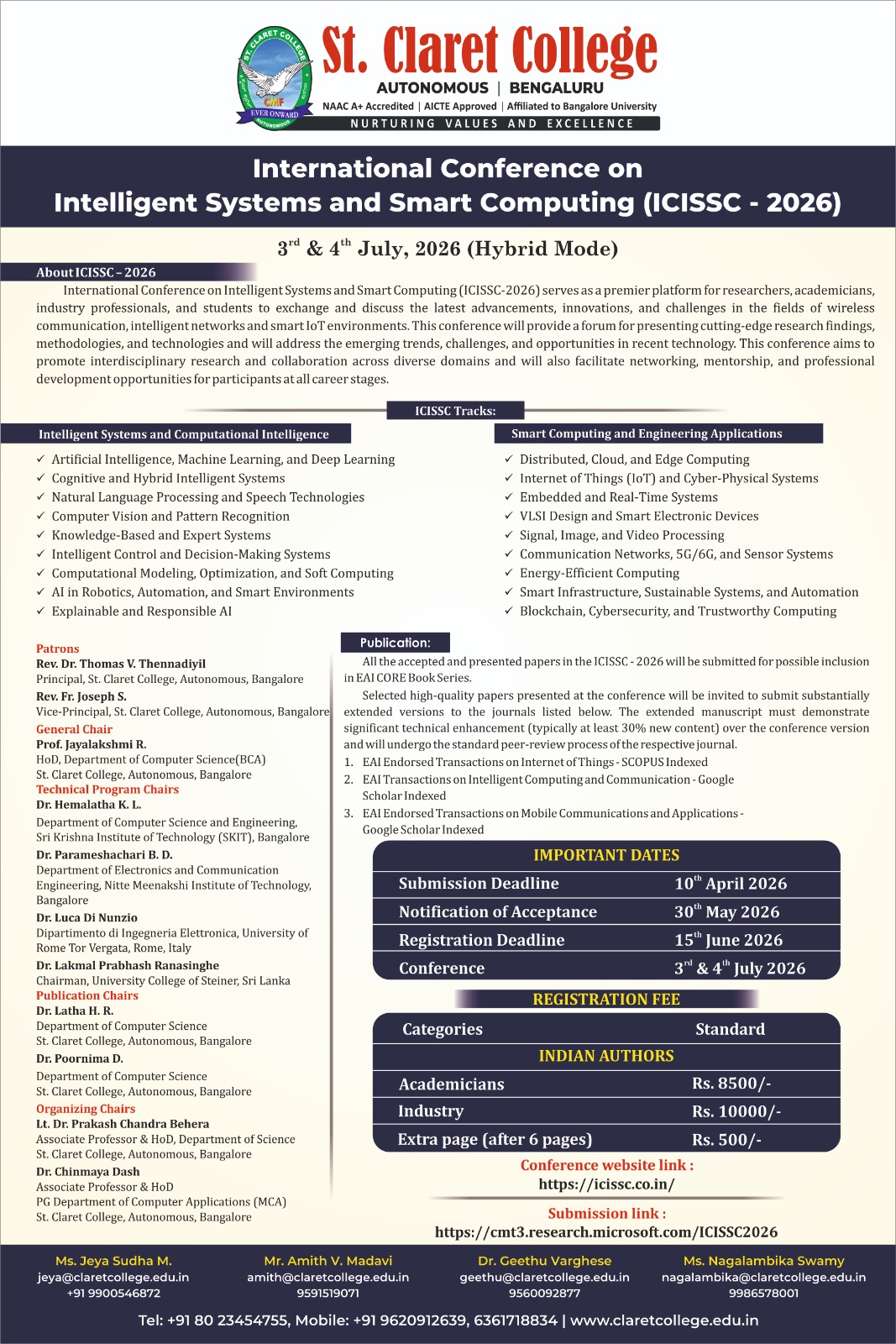 International Conference on Intelligent Systems and Smart Computing (ICISSC-2026) serves as a premier platform for researchers, academicians, industry professionals, and students to exchange and discuss the latest advancements, innovations, and challenges in the fields of wireless communication, intelligent networks and smart IoT environments. This conference will provide a forum for presenting cutting-edge research findings, methodologies, and technologies and will address the emerging trends, challenges, and opportunities in recent technology. This conference aims to promote interdisciplinary research and collaboration across diverse domains and will also facilitate networking, mentorship, and professional development opportunities for participants at all career stages.